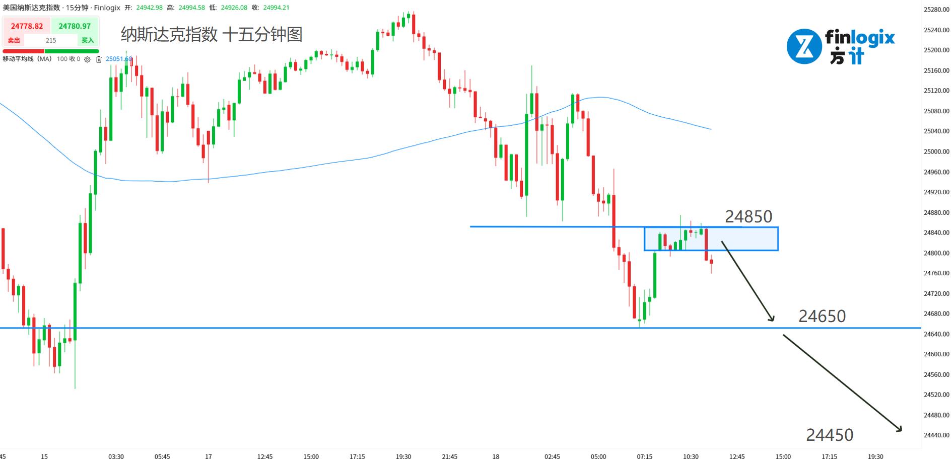 技术面: 100均线转头向下,纳指跌破前低点后回踩24800关口,交易策略以高位做空为主。一旦价格跌破前低点,那么恐慌情绪可能让纳指进一步快速下跌。