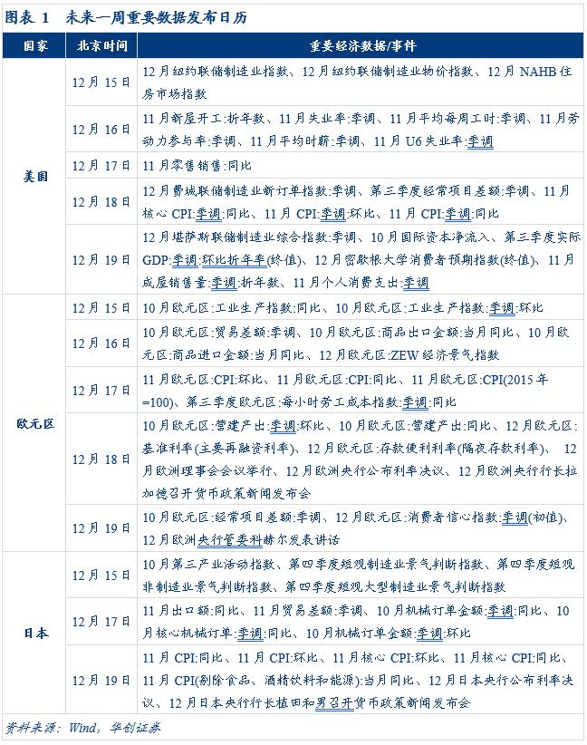 3)美联储如期降息25BPs。美联储在12月FOMC会议上如期降息25BPs,为年内连续第三次降息,联邦基金目标利率区间降至[3.50%,3.75%]。会议声明删除对失业率“较低”的描述,认为失业率在截至9月小幅上升,增加“考虑进一步调整利率的程度和时机”表述。声明还宣布美联储将根据需要启动短期国债购买,以维持充裕的准备金供应。经济展望显示,美联储有更加乐观的经济预期、更低的通胀预期和失业率预期。点阵图显示,2026年和2027年分别各有一次25BPs的降息,中性利率水平为3%。鲍威尔在会后的新闻发布会上表示,近几个月就业的下行风险似乎有所上升,预计今年年底失业率为4.5%,关税对通胀的影响将是相对短暂的,实际上是物价水平的一次性变动。