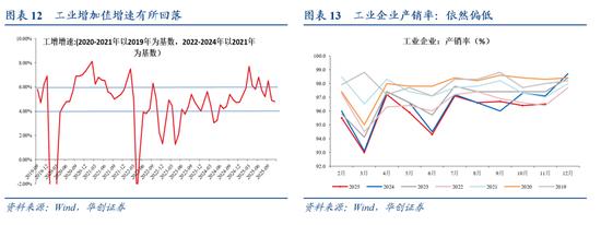 11月,工业增加值同比增速为4.8%。季调环比来看,11月为0.44%,前值为0.17%。1-11月累计来看,工增增速为6.0%,属于偏高水平。产销率来看,11月份,规模以上工业企业产品销售率为96.5%,同比回落0.8个百分点。