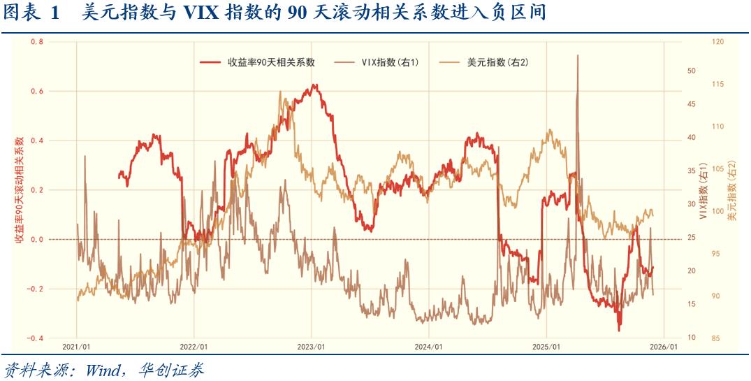 美元指数与VIX指数之间的正相关性在过去一年多的时间里出现了脱钩的现象。过去VIX指数的上升往往伴随着美元走强,凸显了美元作为风险对冲工具的防御属性。然而,过去一年多的时间里,美股波动率的增加反而频繁伴随美元走软,两者的90天滚动相关系数跌入了负区间。截至2025年11月底,美元指数与VIX指数的90天滚动相关系数为-0.11。这一变化体现了美元在应对权益资产波动时的防御属性正在下降。