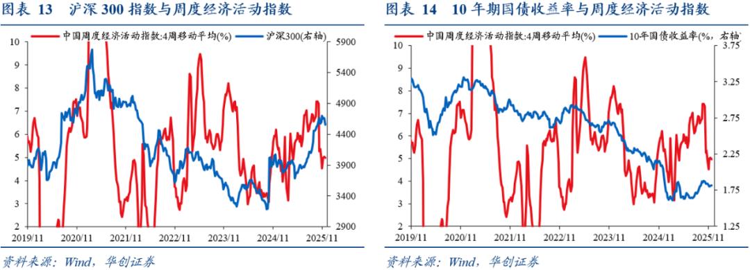 华创宏观周度经济活动指数是衡量经济基本面状况的高频指数,可以通过资产价格与周度经济活动指数的走势观察股债资产价格与经济基本面的背离状况。我们对华创宏观中国周度经济活动指数的4周移动平均与10年期国债收益率以及沪深300指数做时差相关分析,发现过去一年来两者的时差相关系数分别约为0.21和0.18。