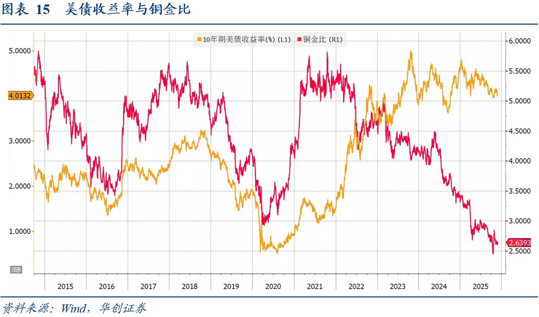铜金比通常被认为是美债收益率的领先指标,其背后的原理是:铜具有工业属性,被广泛应用于电子电气、家电、机械、建筑等领域,铜的需求通常反映了实体经济的活跃程度;而黄金具有价值储藏功能和避险价值。铜金比可以作为市场对风险资产的偏好和对美国国债安全的感知程度的指标。