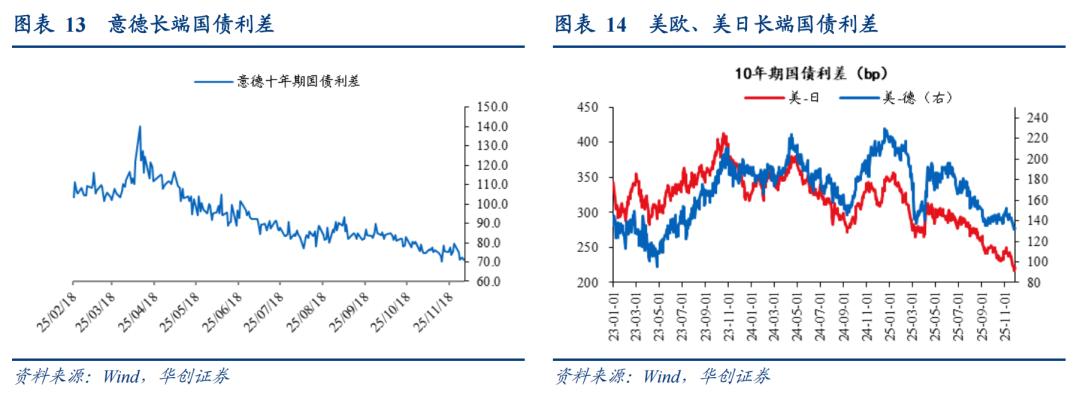 美日、美德的长端国债利差收窄。截至11月28日,美日10年期国债利差为221bp,较前一周收窄5.5bp;美欧10年期国债利差为133bp,较前一周收窄6bp。