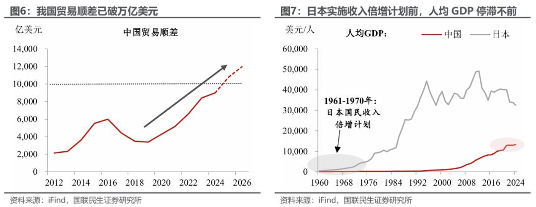 当前中国正处于迈向“中等发达国家”的关键阶段。参考上世纪60年代的日本,在经济爬坡过坎、人均收入亟待突破的关键节点,将“增收”确立为国家战略的核心目标。日本曾以“十年人均国民收入翻倍”锚定方向,而我国也明确提出“到2035年人均GDP达到中等发达国家水平、比2020年翻一番”的远景目标。同时,当前我国面临的时代背景已截然不同——我国贸易顺差已破万亿美元,面对外部环境不确定性加剧的现实,亟需加速构建内循环。