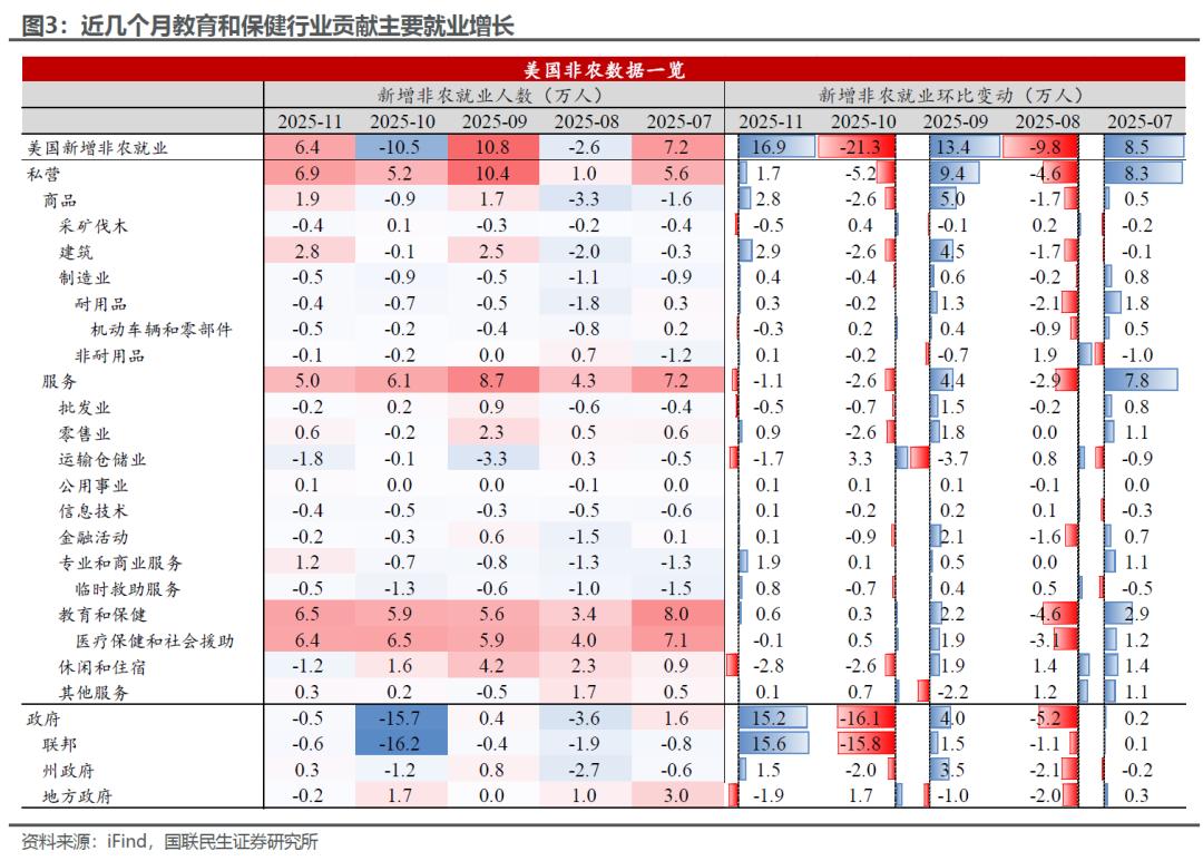 其一,10-11月新增非农就业显著回落,但政府部门是主要拖累项。11月联邦政府就业减少0.6万人,10月更是大幅缩减16.2万人,成为拖累就业的最大抓手,主要原因在于特朗普政府“延迟辞职计划”的影响(年初接受辞职提议的雇员将继续领取工资到9月底),这使得10万名以上的政府雇员在10月后陆续离职,成为非农下降最大的“技术性噪音”。