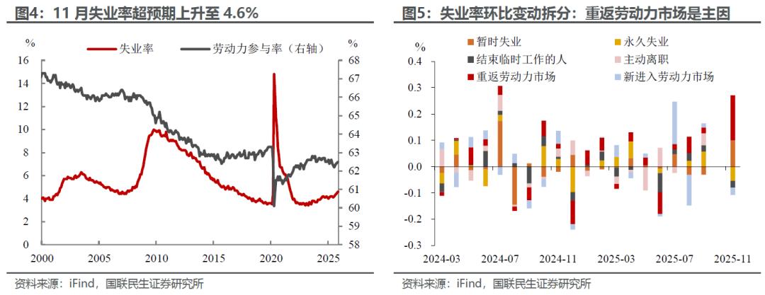 而11月失业率也是超预期升至4.6%,创下2021年9月以来的最高水平,但本期失业率上升存在一定的供给扰动。一方面,11月劳动参与率同步攀升至62.5%;另一方面,从失业原因拆分来看,当月失业率上升主要源于重返劳动力市场的人数增加,不完全是需求端大幅萎缩所致。