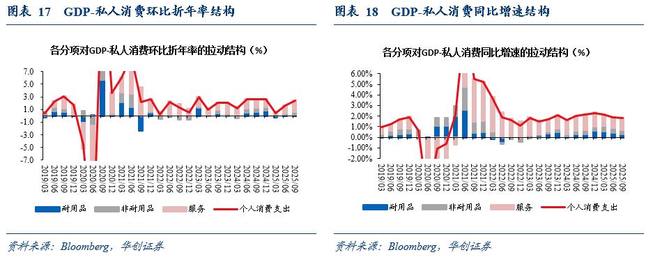 消费方面:是经济超预期的核心来源之一,服务消费仍是主要拉动项,耐用品消费延续偏弱。Q3私人消费环比折年率+3.5%,前值+2.5%,预期+2.7%,同比+2.6%(前值+2.7%);私人消费对整体GDP环比增速的拉动率为2.4%。服务消费依然是主要拉动项,服务消费环比折年率录得+3.7%,前值+2.6%,医疗、娱乐仍是主要支出项。耐用品消费增长继续偏弱,环比折年率录得+1.6%,前值+2.3%,其中,汽车、家具和耐用家用设备消费大幅下滑,环比折年率均为负,分别录得-6.8%、-4.1%。而Q3非耐用品消费增长则偏强,环比折年率录得+3.9%、前值+2.2%,但主要拉动项为汽油和能源分项,或与油价上涨有关。