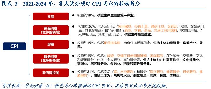 为更深入和结构性地从供需角度理解CPI的变化,我们对CPI项目进行重新分组。将CPI拆分为食品(权重约19%,下同)、竞争性领域商品(约26%)、竞争性领域服务(约19%)、房租(约15%)、政府管控类商品和服务(约21%)。
