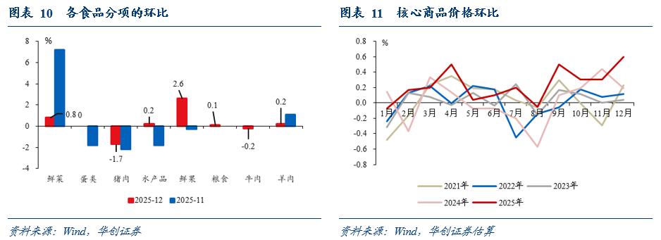 从季度来看,2025年CPI同比前低后高,核心CPI同比逐季度上行,PPI同比呈V形走势。1-4季度,CPI同比分别为-0.1%、0%、-0.2%、0.6%,核心CPI同比分别为0.3%、0.6%、0.9%、1.2%,PPI同比分别为-2.3%、-3.2%、-2.9%、-2.1%。2025年4季度,CPI食品同比、核心CPI同比和PPI同比均为年内高点,预计4季度的GDP平减指数约-0.4%,1-3季度分别为-0.8%、-1.2%、-1%。